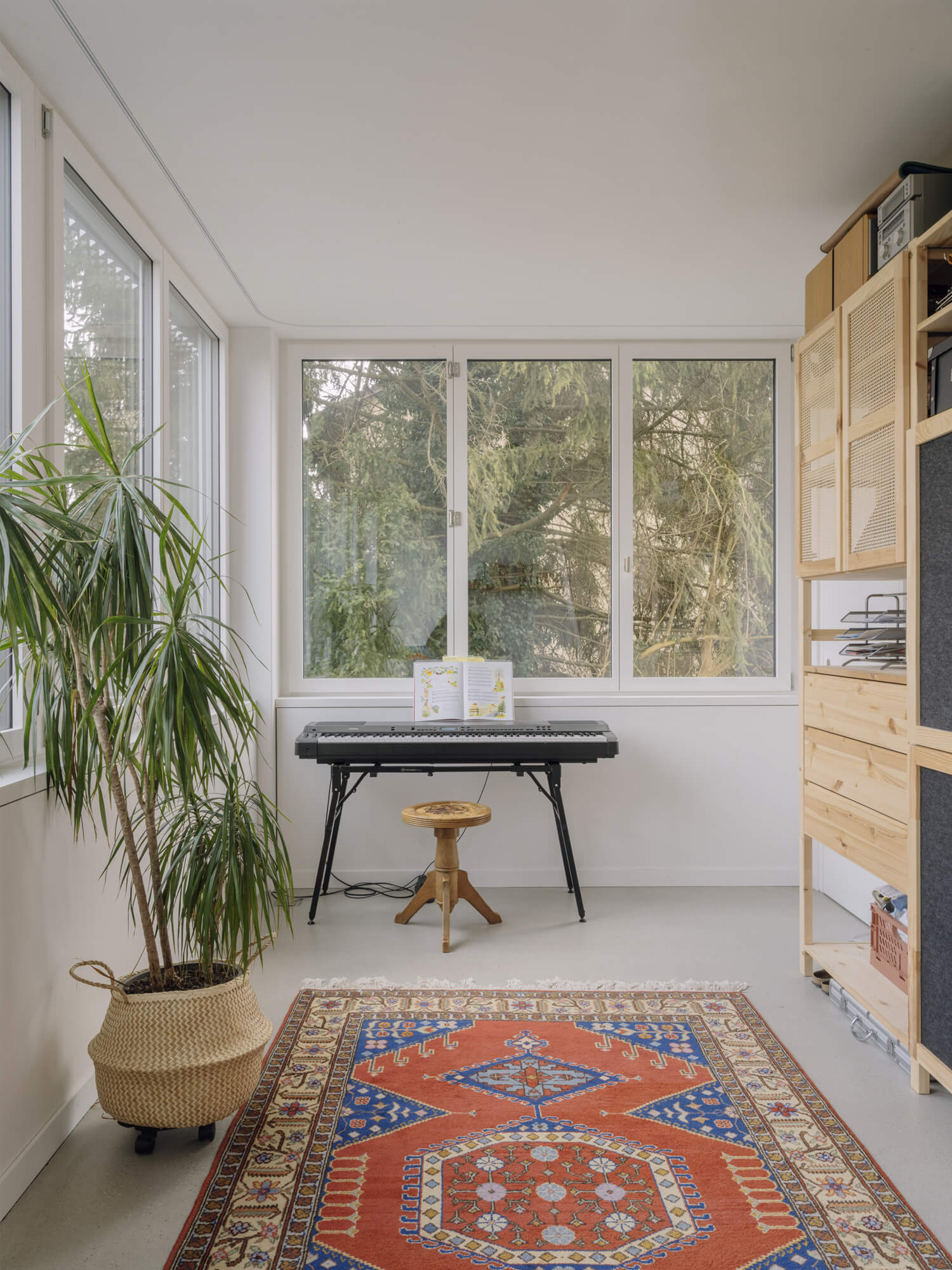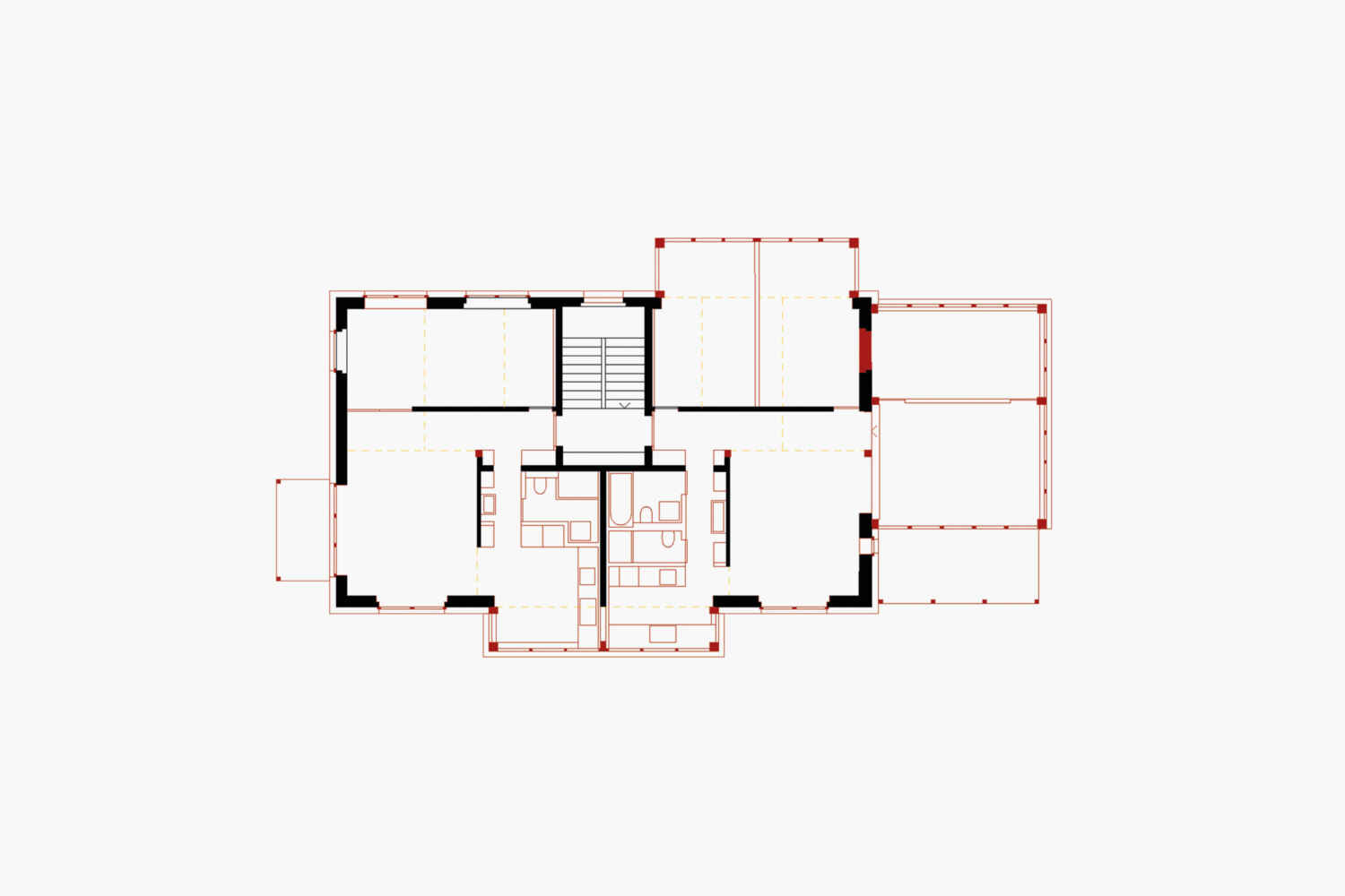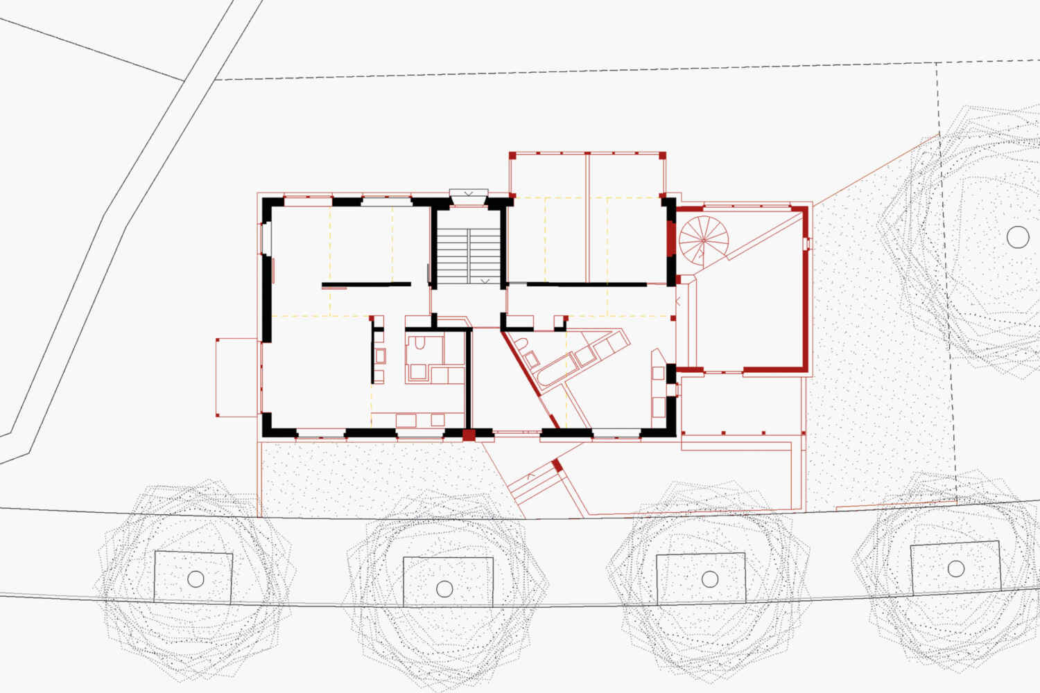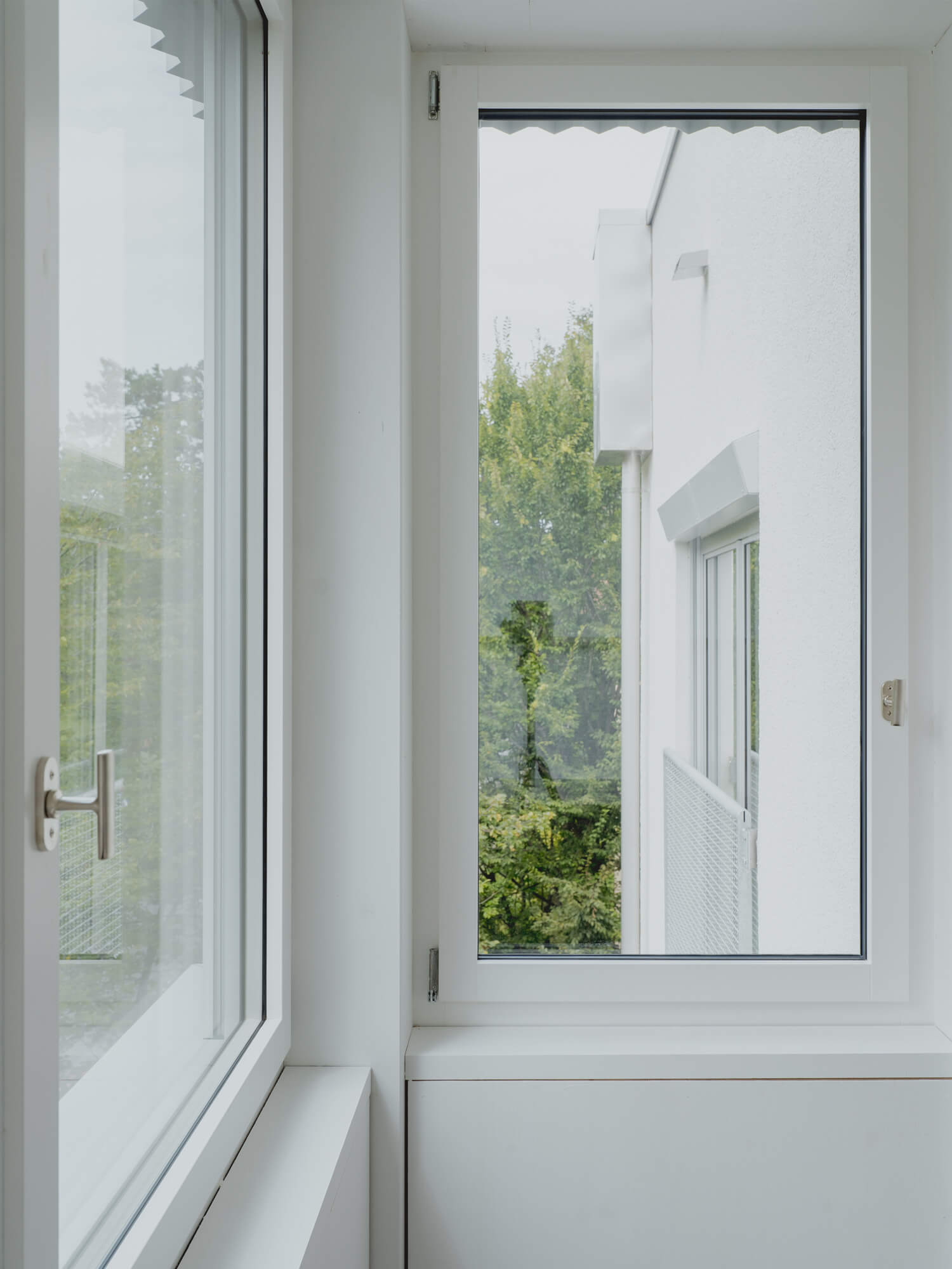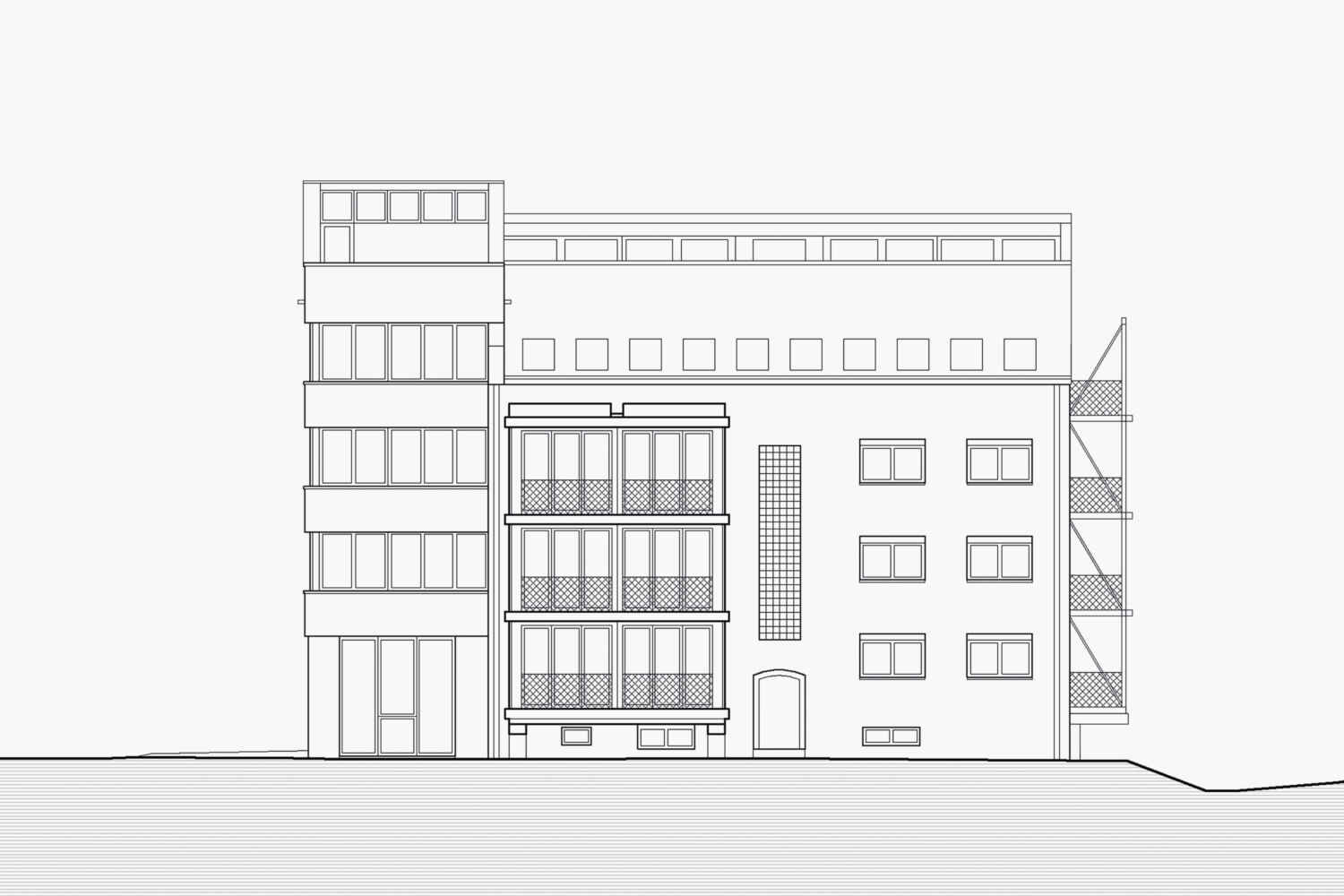 Free of conservational claims, substantial interventions were carried out in and on the building. An annex extends the volume, a bay window or balcony was added to each side and a new roof was built on its top. A centred bay window and a new entrance clearly address the house to the street and give the building an urban physiognomy.
